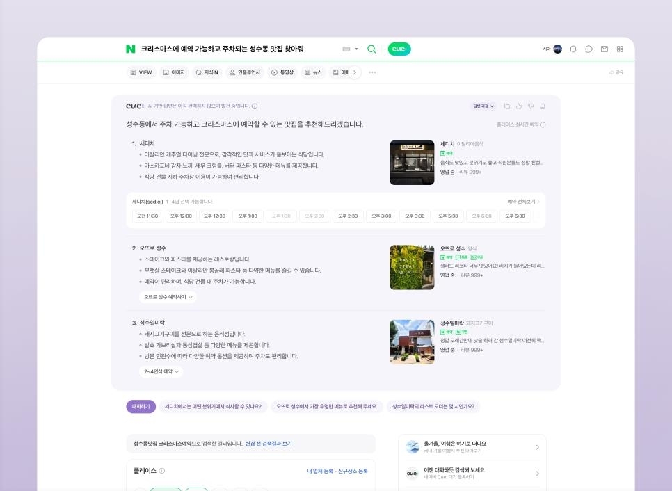 가령 '크리스마스에 예약할 수 있고 주차되는 성수동 맛집을 찾아줘'라는 질의에 기존 검색에서는 각각의 정보를 하나씩 확인해야 했다면, 큐:가 통합된 네이버 검색에서는 사용자가 원하는 조건에 부합하는 장소를 네이버 정보와 예약 시스템을 연동해 검색 결과 상단에서 한 번에 볼 수 있다.