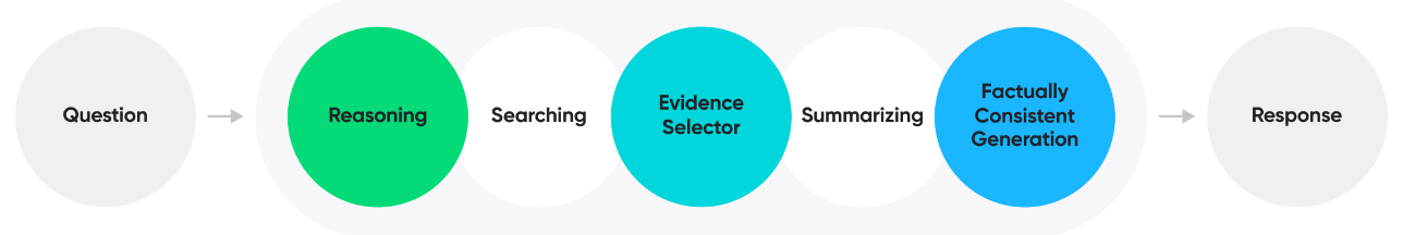 Cue:는 언어 모델에 Reasoning, Planning, Tool Usage, Retrieval-Augmented Generation을 녹여내어 만든 기술입니다. Cue:는 사용자 질의가 들어오면 멀티 스텝 추론(Multi-Step Reasoning)을 통해 네이버의 서비스들을 어떻게 사용하여 사용자의 검색 목적을 달성할 수 있는지 계획합니다(Planning). 이러한 추론 과정을 사용자에게 보여줌으로써 사용자는 Cue:가 어떤 이유로 해당 답변을 제공하는지 논리의 흐름을 명확히 알 수 있습니다. 그리고 네이버의 서비스들을 툴로 사용하면서 수립된 검색 계획을 수행하고(Tool Usage), 검색된 결과를 바탕으로 답변을 생성합니다(Retrieval-Augmented Generation). 답변 생성 과정에서 할루시네이션(Hallucination)을 줄이기 위해 보다 신뢰성 있는 결과를 선택하고(Evidence Selection Process), 검색 결과와 답변의 사실성이 일치되도록 답변을 생성하며(Entailment-Based Factually Consistent Generation), 사실적 일관성의 확인을 위해 모델이 자신의 답을 점검하는 자기 성찰(Self-Reflection)기법을 사용하여 사용자에게 사실적 일관성이 비약적으로 향상된 검색 결과에 기반한(Grounding) 답변을 제공합니다.