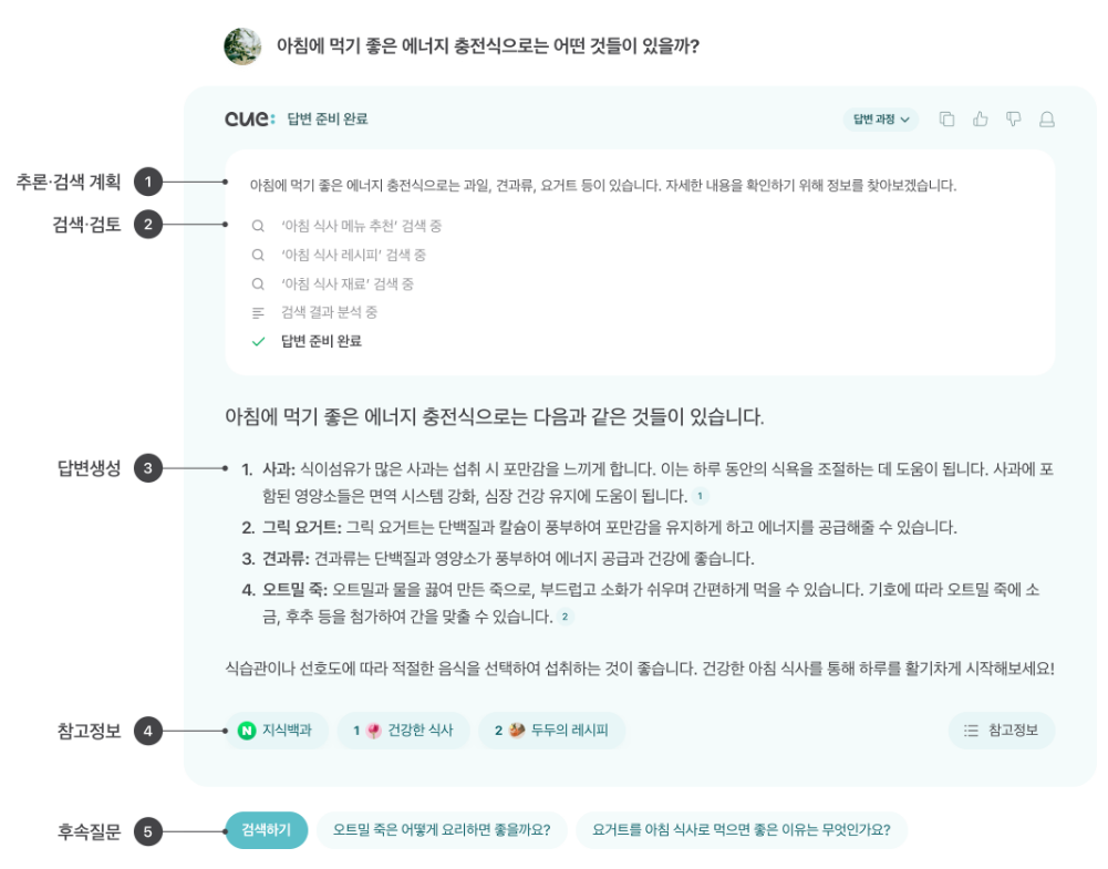 Cue:는 하나의 대형 언어 모델을 사용하는 것이 아닌, 크기가 다르고 기능들이 각자 다른 다수 언어 모델들을 사용합니다. 이런 언어 모델들을 합쳐서 모듈화된 LLM 플랫폼(Modularized LLM Platform)으로 설계하여 모든 사용자의 요청에 대해 전체 모델이 지속적으로 동작하는 것이 아니라, 사용자의 검색 의도를 만족시키는데 필수적인 부분만 동작 시킴으로써 효율성(Efficiency)을 향상시키고 응답 속도를 끌어올렸습니다. 그리고 이런 모듈화된 LLM(Modularized LLM)들은 사용자 만족도를 보상 신호(Reward Signal)로 사용하여 End-to-End로 Platform-Level에서 학습시켰습니다. 그래서 Cue:는 플러그인(Plug-in)을 사용하는 타 생성형 LLM 서비스와는 차별화됩니다.