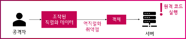 전송받은 데이터를 역직렬화하는 과정에서 데이터 무결성을 검증하지 않고 그대로 서버로 전달한다면 원격코드 실행이나 인젝션, 권한 상승과 같은 공격 발생 가능성 존재