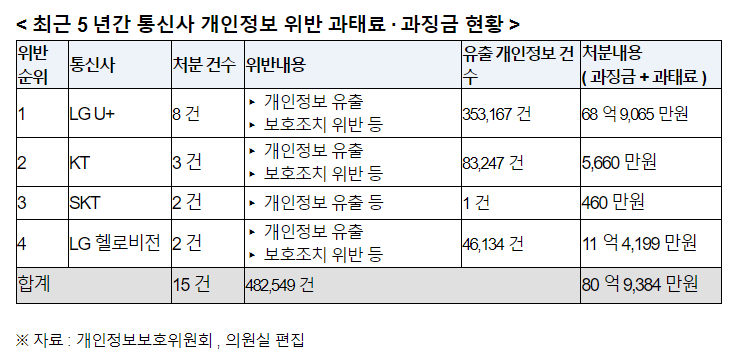 최근 5년간 우리나라 전체 통신사의 유출 개인정보 건수는 모두 48만2천549건에, 과태료·과징금 부과처분 금액이 총 80억9천384만원인 것으로 나타났습니다.