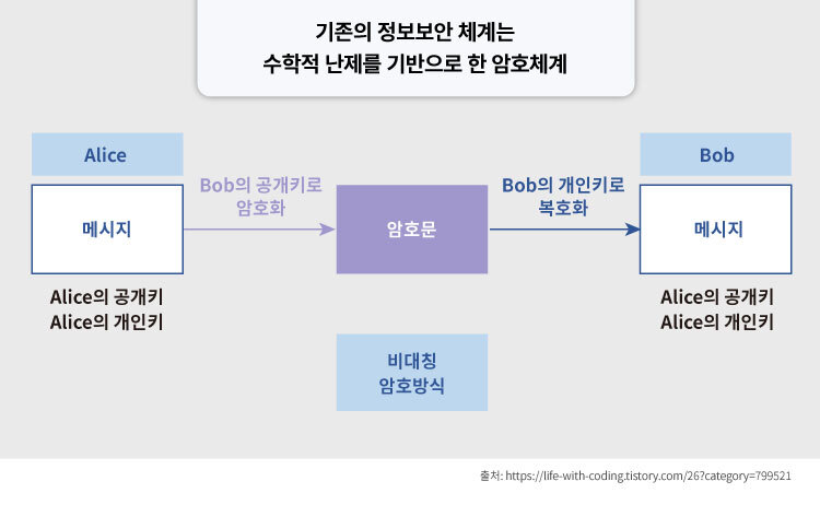 현재 우리가 사용하고 있는 정보통신 암호체계의 대다수는 그림처럼 비대칭 암호방식이며 RSA(수학 난제) 알고리즘에 기반하고 있습니다. 수학적 복잡성에 의존한 암호방식이고, 소인수분해 문제를 통한 수학 난제에 기반하고 있어 풀기가 매우 어렵고 시간이 오래 걸리기 때문에 해커들이 이러한 시스템을 위협하기가 쉽지 않습니다.